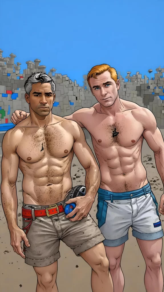 On a sun-drenched Saturday afternoon, Marcus and Tyler stood shirtless in the park, their skin kissed by the summer heat. Marcus, the calm and athletic one, held a football in one hand and Tyler’s water bottle in the other, casually glancing over at his beefcake boyfriend with a small grin. Tyler, the redhead with a fiery spark to match, tightened his jaw in mock seriousness as they prepared for yet another playful game of one-on-one.