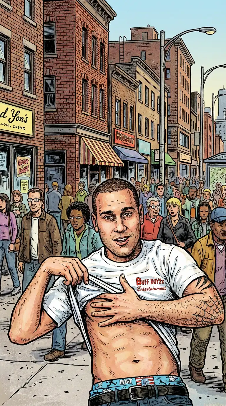 From Long Island is where Steve comes from. Although he identifies as straight he admits to having some encounters with men. His t-shirt says Buff Boyzz Entertainment and is still around !