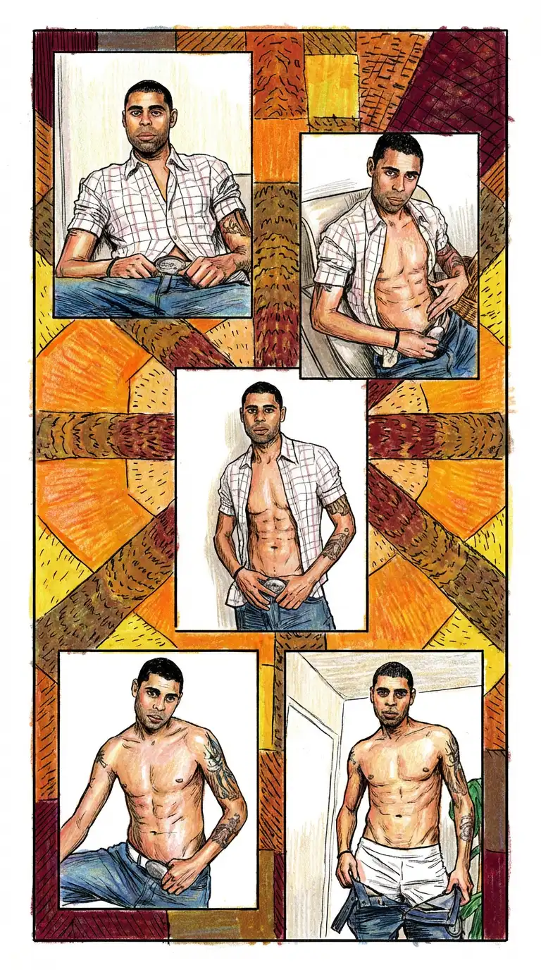 Looking like he just got outta a tanning salon session Pike is extremely dark. He takes off his shirt in this set of photos. Pike even gives up a peak of his behind.