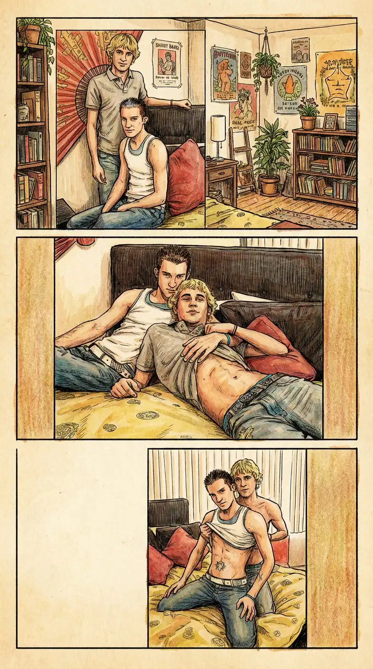 More German models in photos of Timo & Marcel. They play a couple that met during a video shoot. Looks like one thing lead to another and the shirts came off.