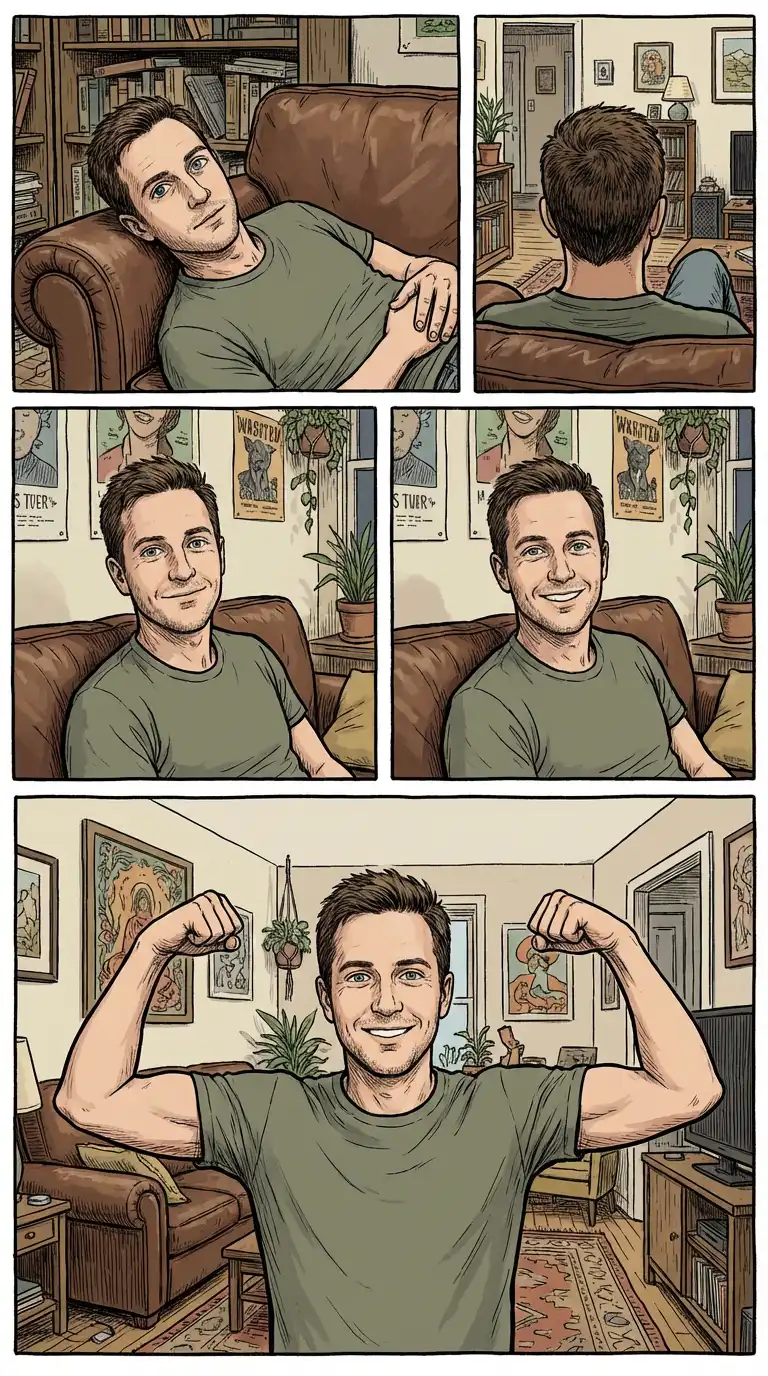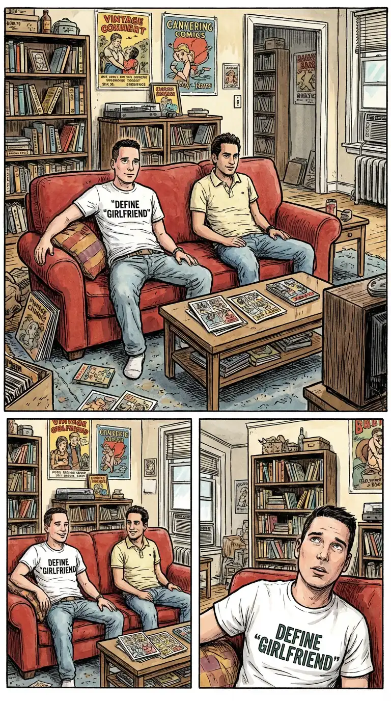 In a sceme that has both AJ and Ben questioning their sexuality – they are photographed on the couch. The “Define Girlfriend” t-shirt on one of the models in a nice touch.