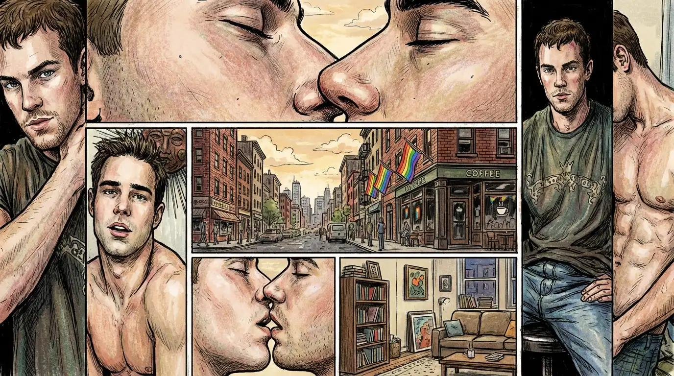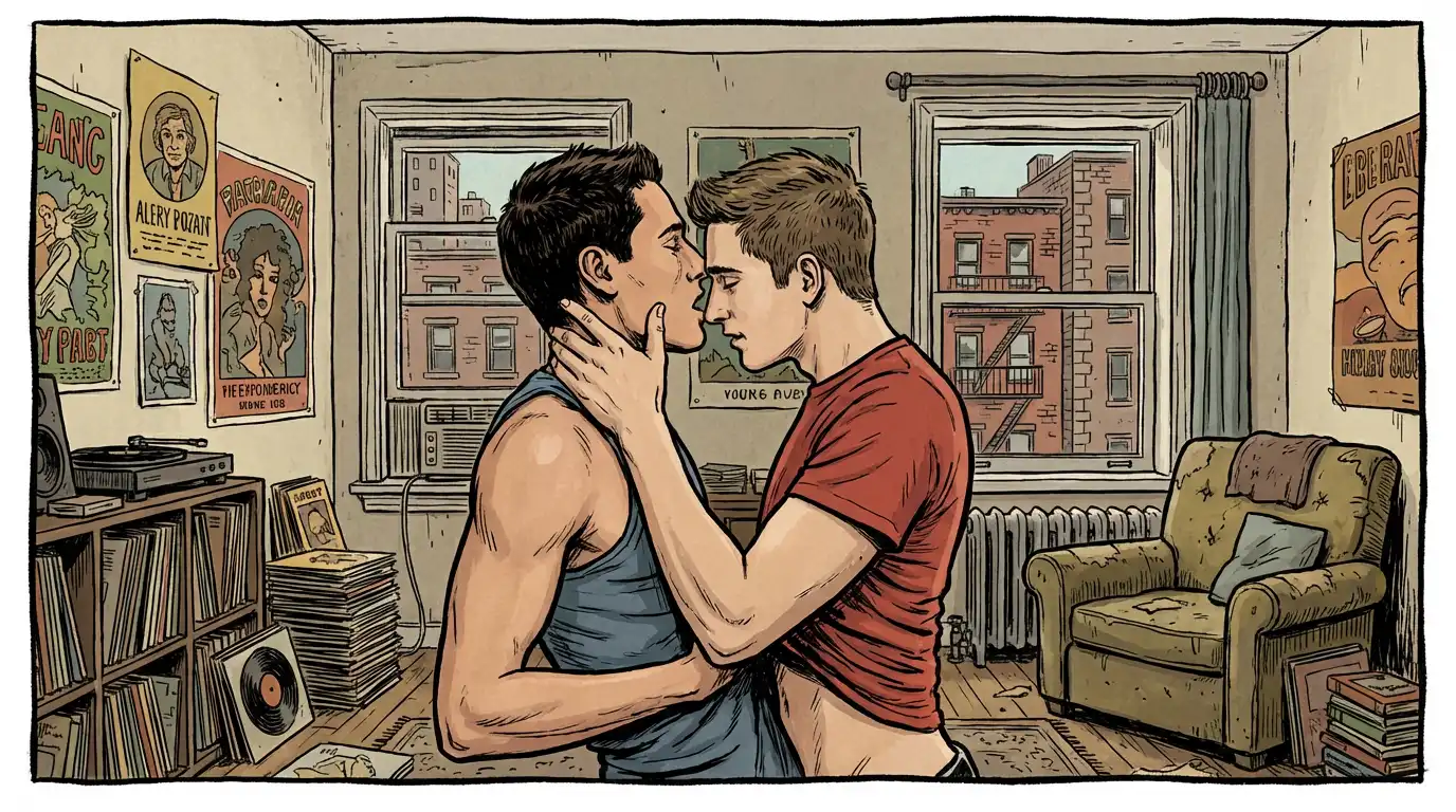 Queer couple Logan and Zach share a kiss on close up. Zach would later appear on several other sites becoming a gay superstar. To this day he still runs his own website with live cam.