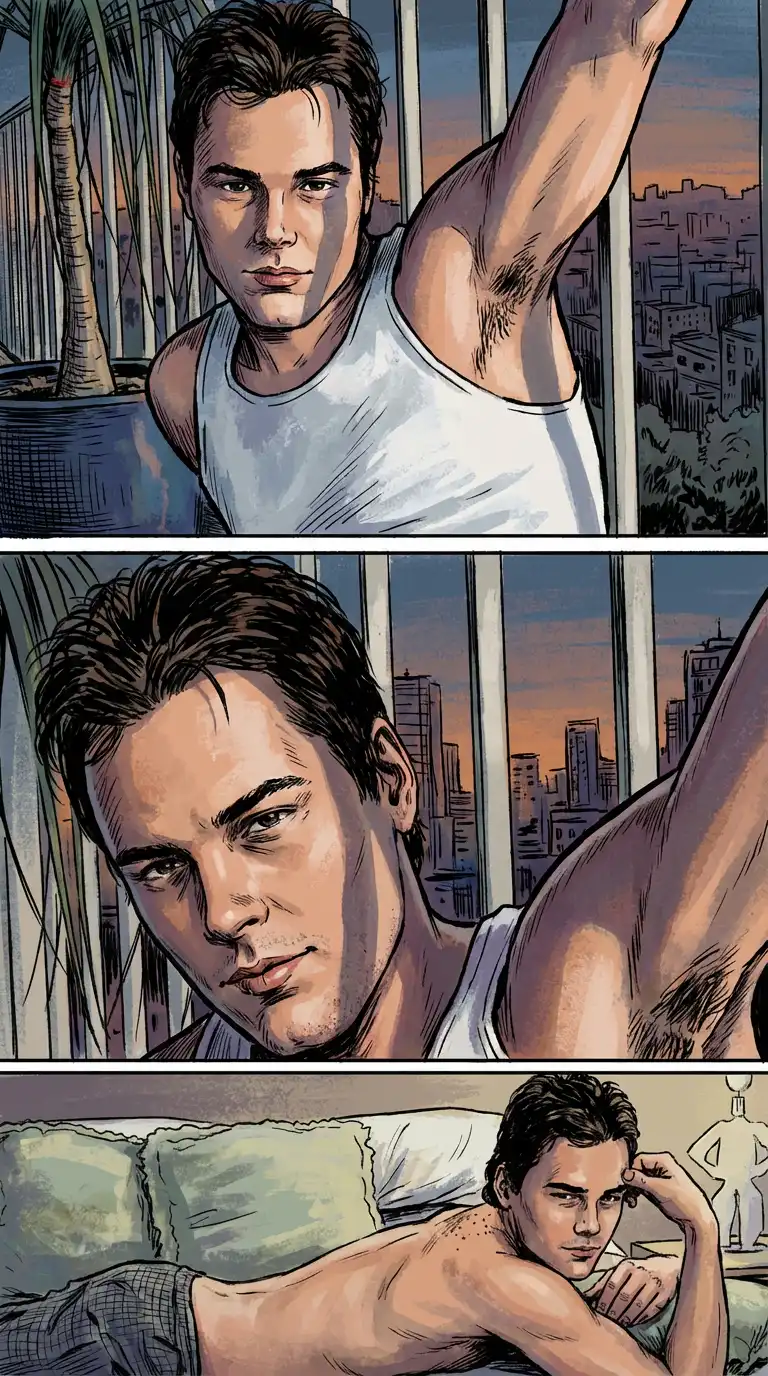 Micah shows off his glistening muscles while wearing a very nice swimsuit that he fills out perfectly. His body seems slightly oiled.