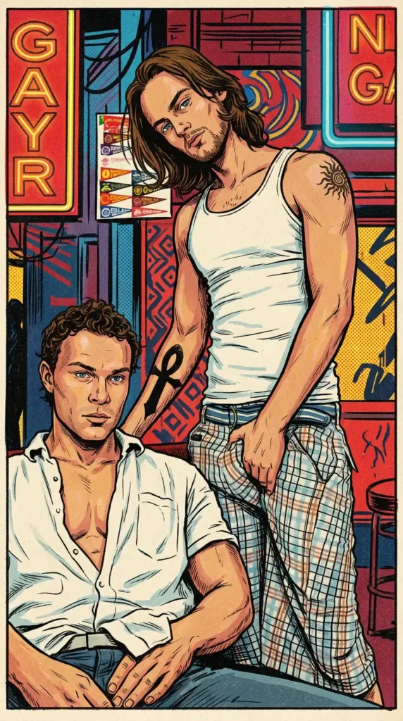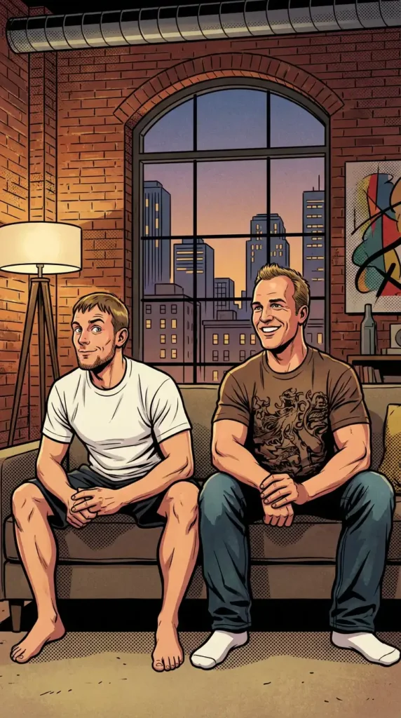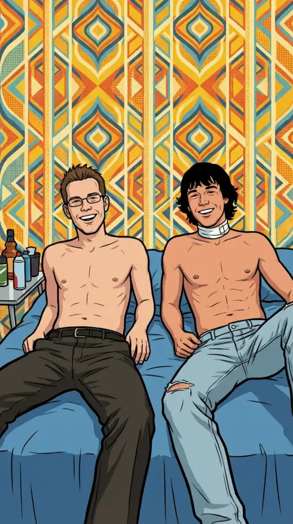 Gay couple Maverick & Tanner look like they are ready for an evening in ! Just take a peek at all that stuff on the night stand.