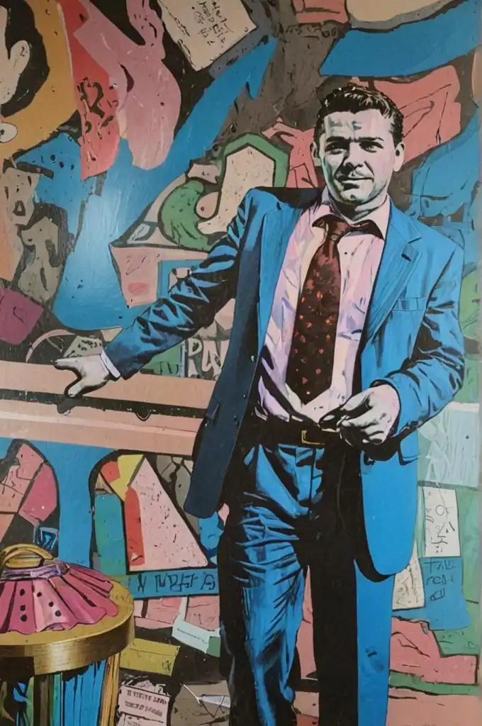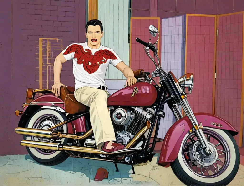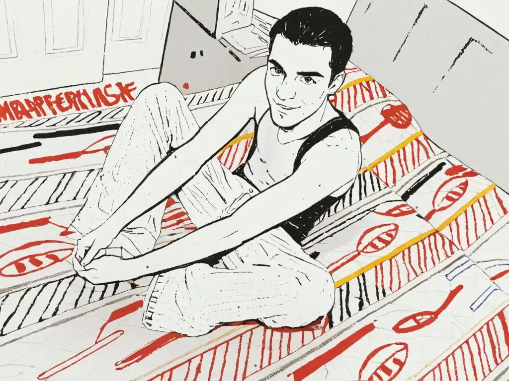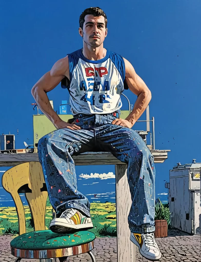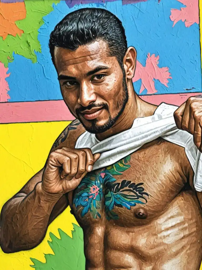 Santos is a striking figure, with a vibrant presence that stands out. His muscular build is accentuated as he lifts his yellow sleeveless shirt, revealing intricate and colorful tattoos that adorn his arms. These tattoos feature artistic floral designs, adding depth to his character.
