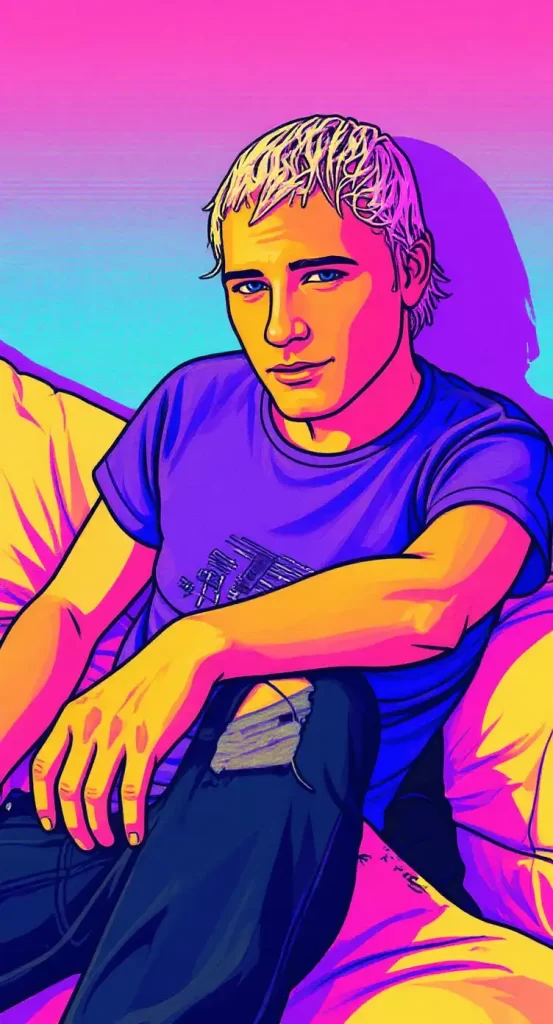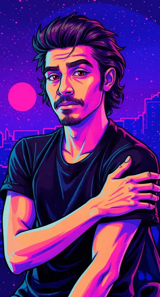 He’s got cheekbones carved by synthwave and a stare that short-circuits your Wi-Fi. Warning: may cause spontaneous swooning and playlist rewrites.
