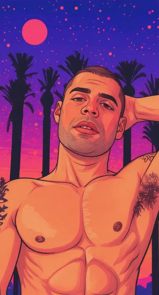 Palm trees, pink skies, and pecs that deserve their own zip code. He’s the reason your iced coffee melted.