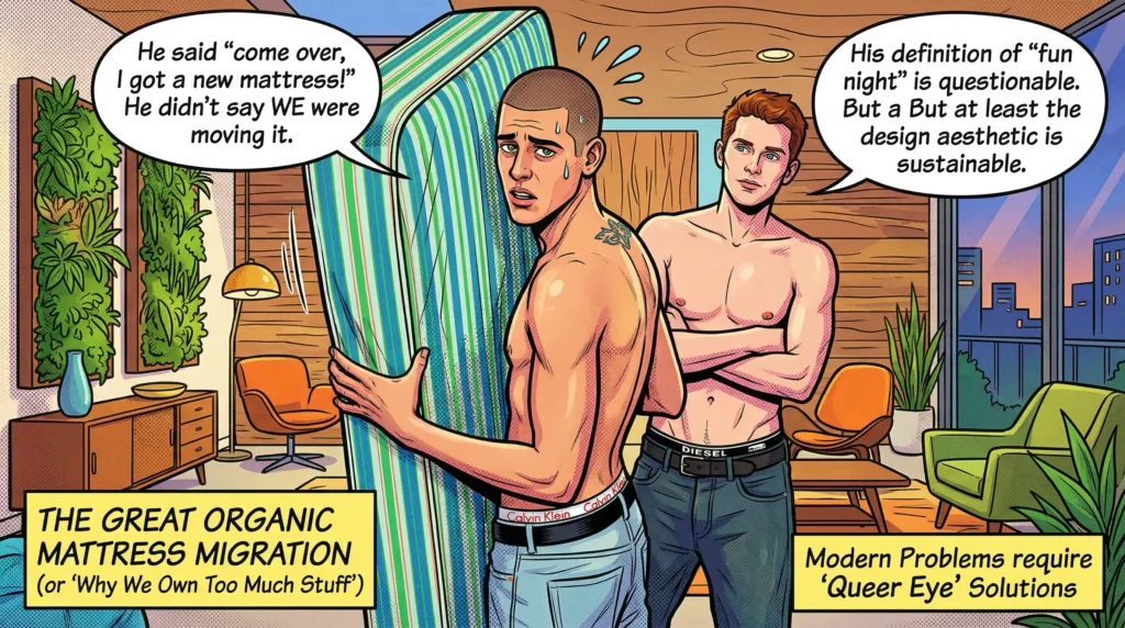 Shane, already sweating, grinned sheepishly. “I said I got a new mattress. I never said I wasn’t going to make you help move it.”
