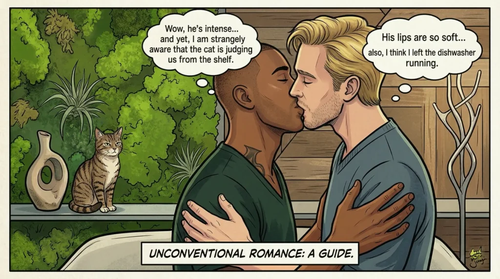 Adam had always imagined that his first kiss with Sterling would feel cinematic—soft lighting, perfect timing, maybe even a soundtrack. What he hadn’t accounted for was Sterling’s cat perched on the shelf behind them, staring down with the judgmental intensity of a tiny, furry philosopher.