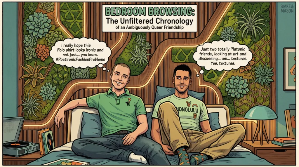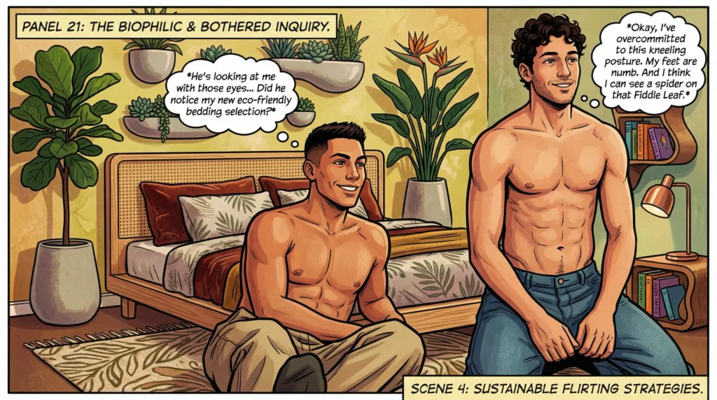Evan had invited Micah over for what he insisted was “a casual hang,” though the room told a different story. The plants were freshly misted, the terrarium gleamed, and the leaf‑green bedding—his proud eco‑friendly upgrade—was smoothed to perfection. He sat cross‑legged on the bed, trying to look relaxed while his heart fluttered like a trapped moth.