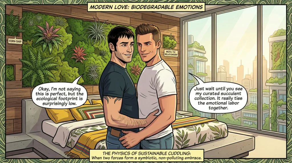 Blake had always joked that his apartment was “one bad day away from becoming a full greenhouse,” but Zander loved it. The moss wall, the ferns, the soft hum of the air purifier—it all felt like stepping into a tiny eco‑sanctuary suspended above the city. Tonight, though, the space felt different. Charged. Expectant.