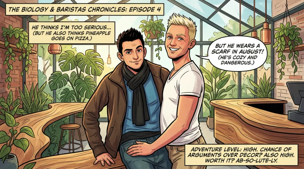 Julian always claimed he came to the greenhouse café for the coffee, but everyone knew it was really for Theo—the barista‑turned‑botany‑student who somehow made humidity look charming. Today, though, Julian wasn’t hiding it well. He lingered by the counter, scarf wrapped dramatically around his neck despite the August heat, pretending to study the ferns.