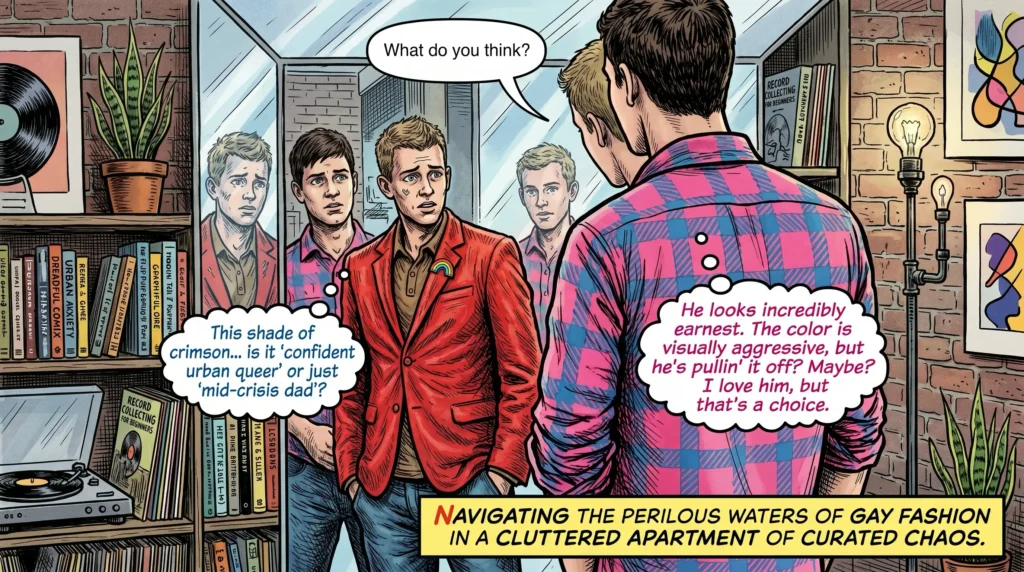 Perry stood in front of the mirror in their cluttered apartment, the red blazer feeling like a dare against his ribs. He pinned the tiny rainbow to the lapel and asked, “What do you think?” The room answered with the soft chaos of their life together: a record player humming a familiar crackle, stacks of graphic novels, a lamp that always leaned a little too close to the couch. Jude, in a pink-and-blue plaid shirt, watched him with a smile that made Perry’s confidence wobble and then settle.
