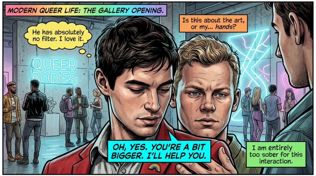 They left the apartment and drifted into the gallery opening, where a neon sign declared QUEER BODIES in electric pink. The room buzzed with people who wore their art and their histories like armor. Jude’s hand found Perry’s in a way that was both casual and deliberate. “Is this about the art, or my… hands?” Perry joked, and Jude laughed—too loud, too honest. “He has absolutely no filter. I love it,” someone nearby murmured, and Jude’s eyes flicked to Perry with a look that said he loved the noise as much as the quiet.