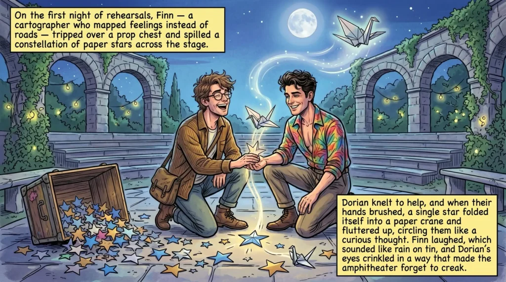 On the first night of rehearsals, Finn — a cartographer who mapped feelings instead of roads — tripped over a prop chest and spilled a constellation of paper stars across the stage. Dorian knelt to help, and when their hands brushed, a single star folded itself into a paper crane and fluttered up, circling them like a curious thought. Finn laughed, which sounded like rain on tin, and Dorian’s eyes crinkled in a way that made the amphitheater forget to creak.