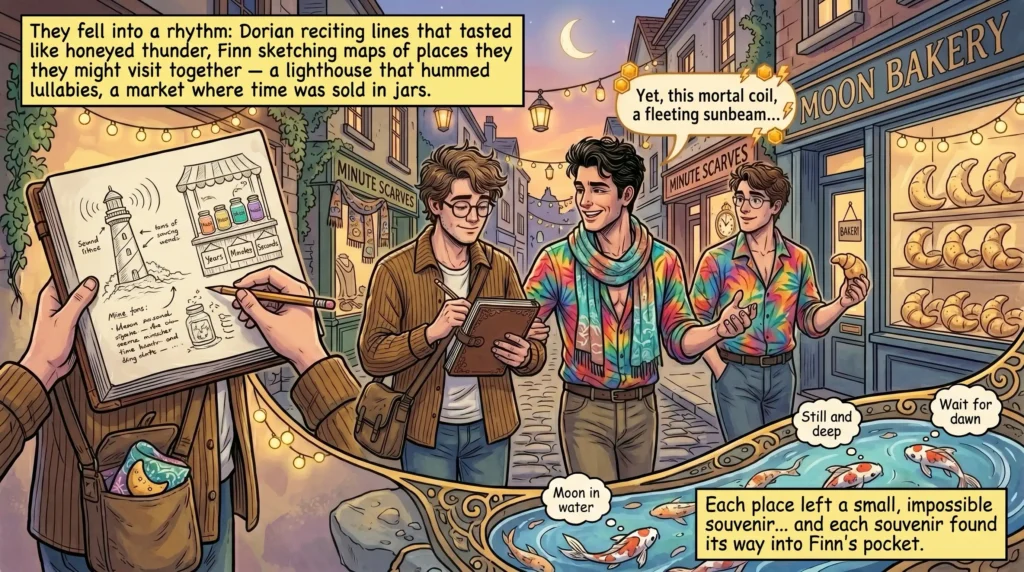 They fell into a rhythm: Dorian reciting lines that tasted like honeyed thunder, Finn sketching maps of places they might visit together — a lighthouse that hummed lullabies, a market where time was sold in jars. Between rehearsals they wandered the town’s oddities: a bakery that sold croissants shaped like crescent moons, a clockmaker who stitched minutes into scarves, and a pond where koi read poetry aloud. Each place left a small, impossible souvenir — a pastry that remembered your childhood, a scarf that smelled like the sea — and each souvenir found its way into Finn’s pocket.
