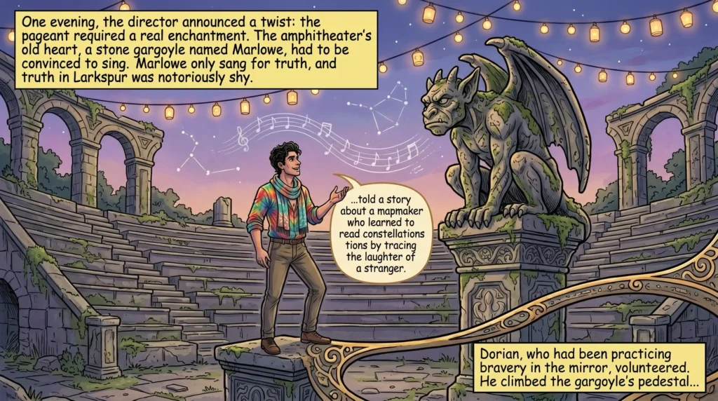 One evening, the director announced a twist: the pageant required a real enchantment. The amphitheater’s old heart, a stone gargoyle named Marlowe, had to be convinced to sing. Marlowe only sang for truth, and truth in Larkspur was notoriously shy. Dorian, who had been practicing bravery in the mirror, volunteered. He climbed the gargoyle’s pedestal and, under a sky freckled with lanterns, told a story about a mapmaker who learned to read constellations by tracing the laughter of a stranger.