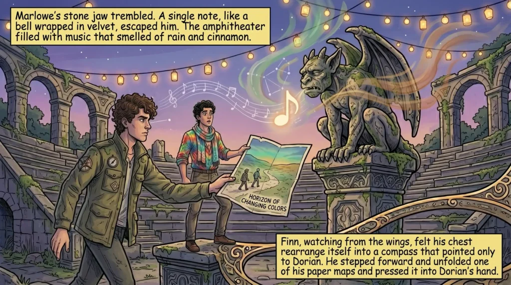 Marlowe’s stone jaw trembled. A single note, like a bell wrapped in velvet, escaped him. The amphitheater filled with music that smelled of rain and cinnamon. Finn, watching from the wings, felt his chest rearrange itself into a compass that pointed only to Dorian. He stepped forward and, without thinking, unfolded one of his paper maps and pressed it into Dorian’s hand. The map had no roads — only a tiny drawing of two figures walking toward a horizon that kept changing colors.