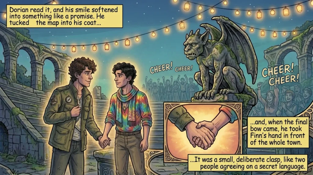 Dorian read it, and his smile softened into something like a promise. He tucked the map into his coat and, when the final bow came, he took Finn’s hand in front of the whole town. It wasn’t dramatic; it was a small, deliberate clasp, like two people agreeing on a secret language. The crowd cheered, but the sound was distant, as if they were underwater and the only thing that mattered was the warmth between them.
