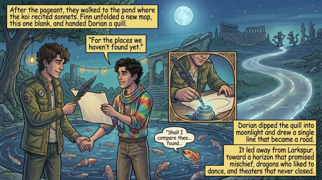 After the pageant, they walked to the pond where the koi recited sonnets. Finn unfolded a new map, this one blank, and handed Dorian a quill. “For the places we haven’t found yet,” he said. Dorian dipped the quill into moonlight and drew a single line that became a road. It led away from Larkspur, toward a horizon that promised mischief, dragons who liked to dance, and theaters that never closed.