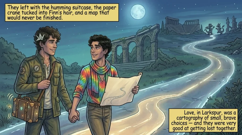 They left with the humming suitcase, the paper crane tucked into Finn’s hair, and a map that would never be finished. Love, in Larkspur, was a cartography of small, brave choices — and they were very good at getting lost together.